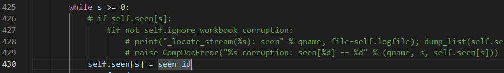 找到 lib\site-packages\xlrd\compdoc.py 第429行,注释掉if,如图